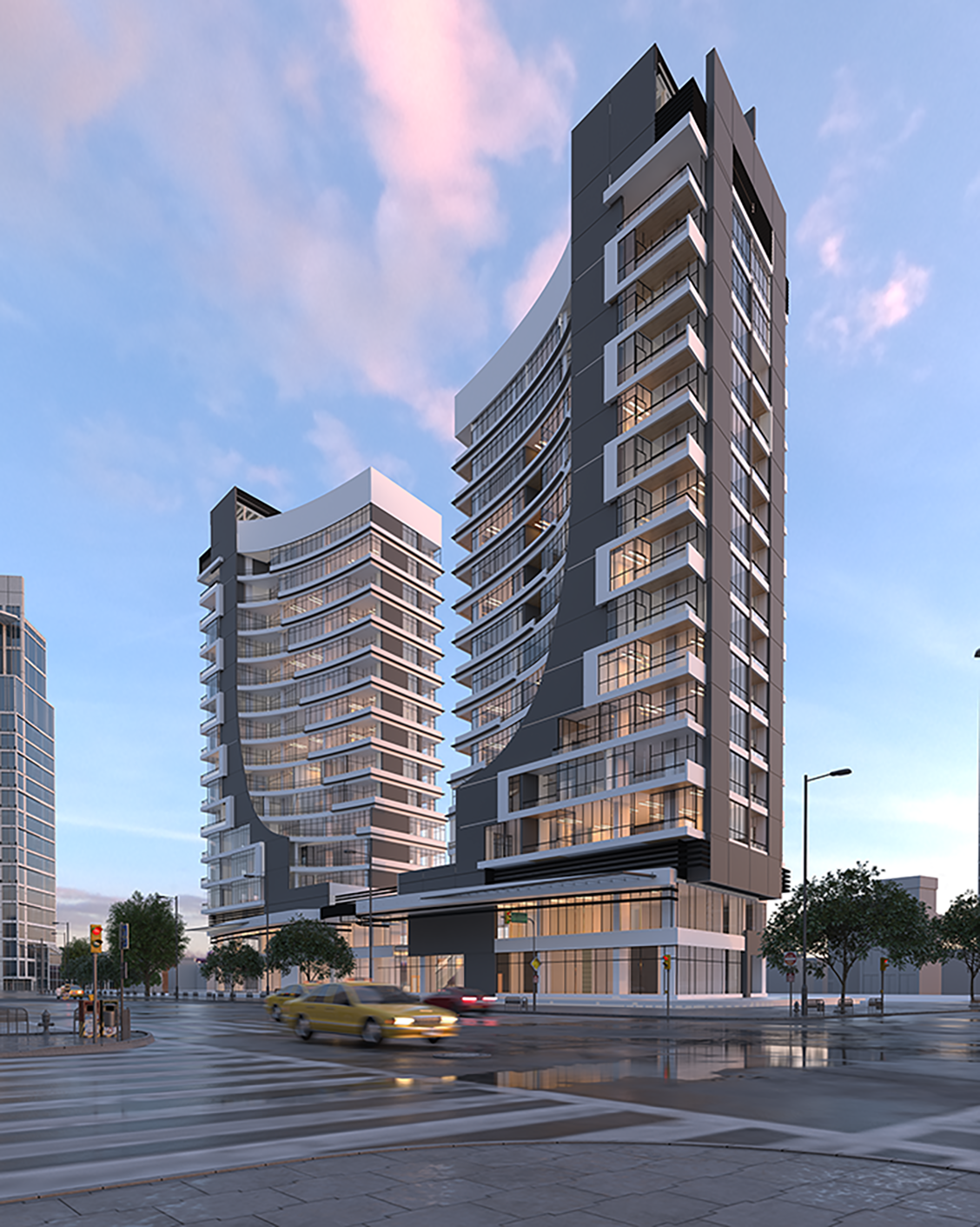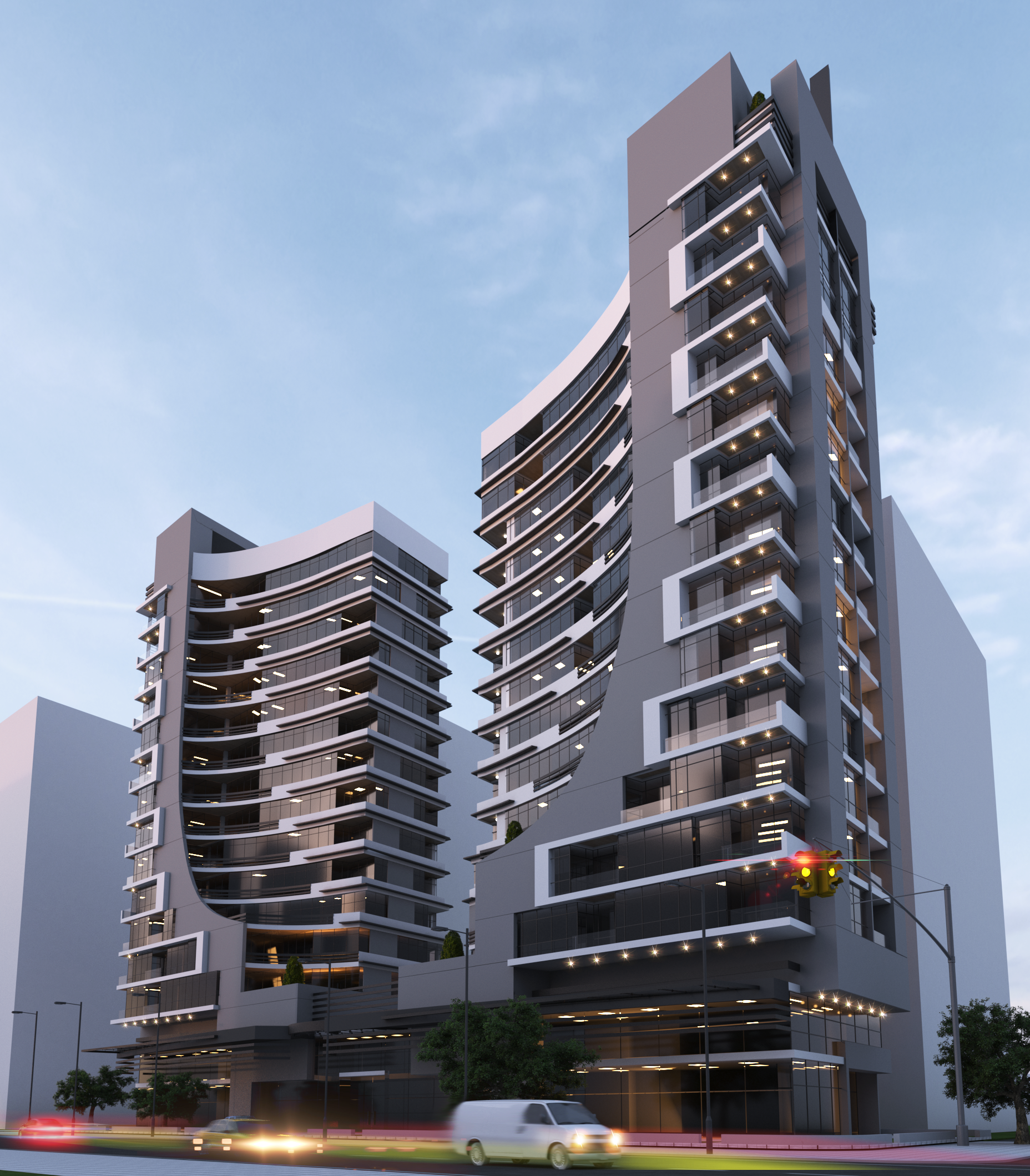 اعتمدت الفكرة التصميمية على تقليص عمق المسافة الفاصلة بين المبنيين وخلق فراغ تعايشي مكانها يتميز هذا الفراغ بالتراجعات المزروعة بعناصر خضراء بالإضافة للتكامل الحجمي المطلوب في هذه الحالة كون المبنيين متجاورين ومتصلين بالطوابق التجارية