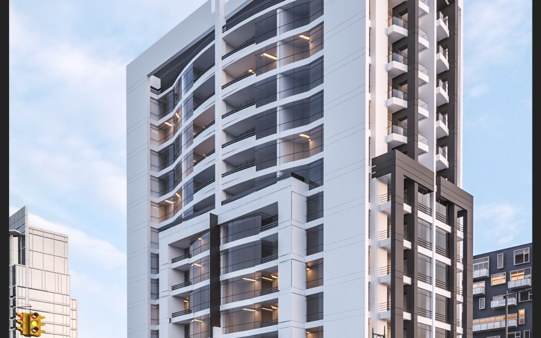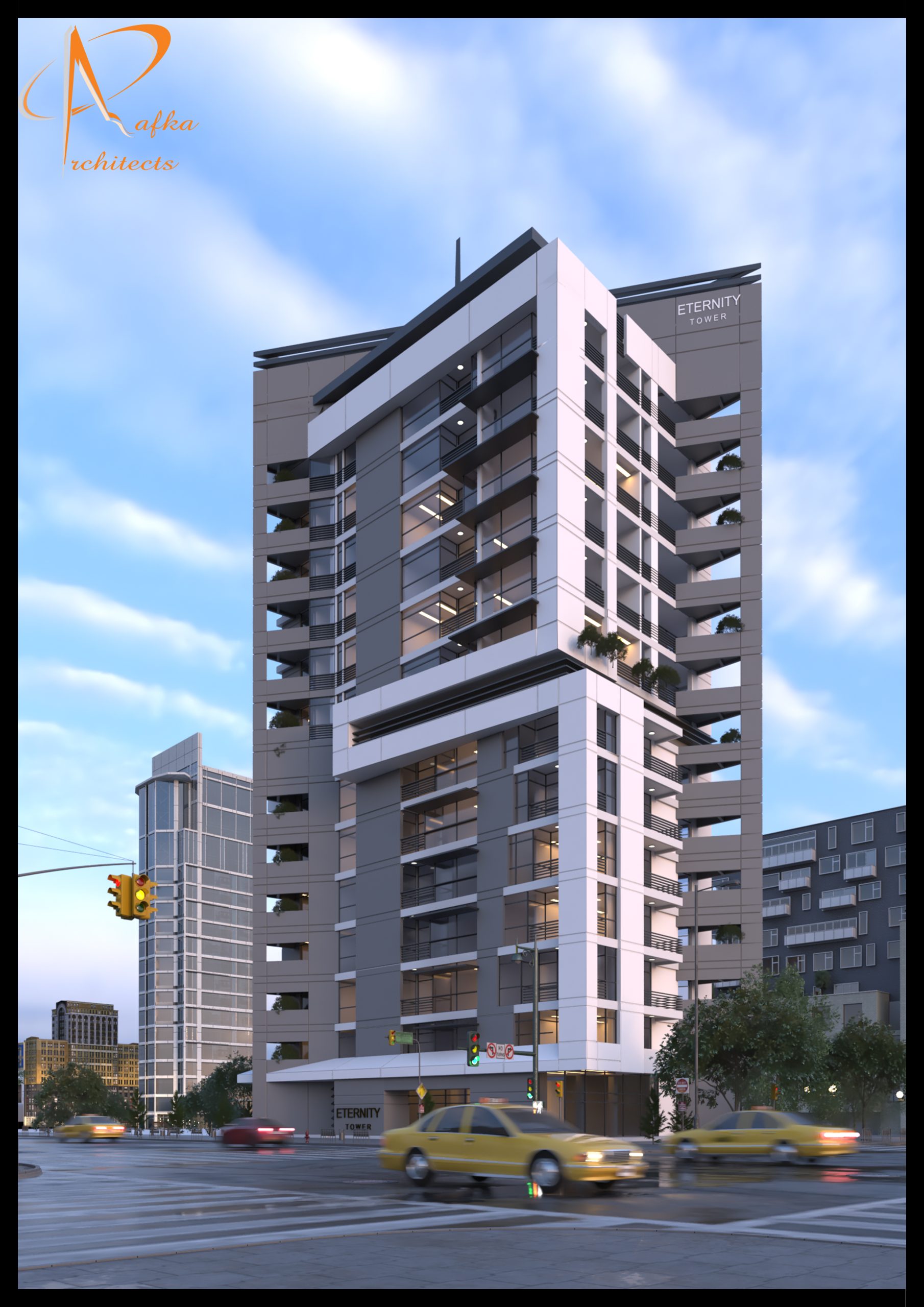 ,مبنى حديث بتصميم أنيق يتألف من 12 طابق سكني إضافة إلى طابق أرضي وطابق تقني مع طابقين أقبية مخصصة للخدمات و المواقف