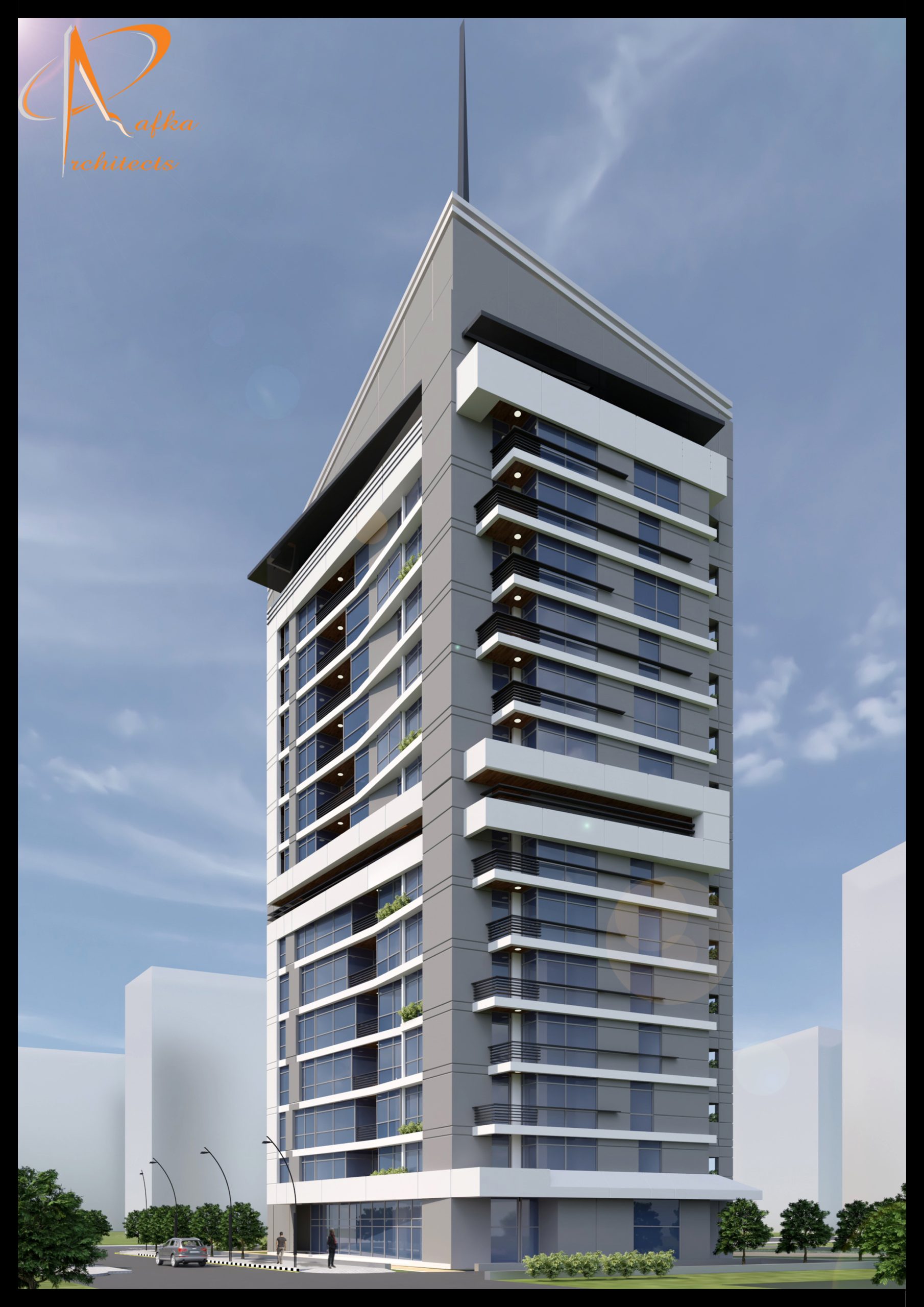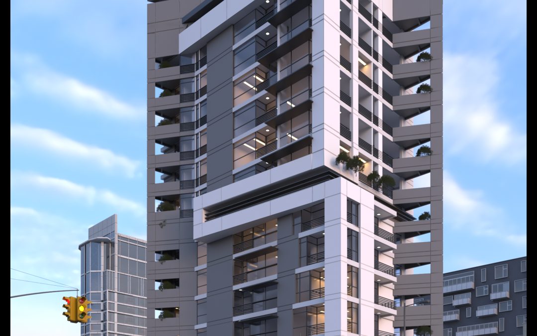 ,يتألف من 12 طابق سكني و أرضي وطابق تقني واحد و 2 أقبية , اعتمدت الفكرة التصميمية على التصميم من خلال تحليل الموقع العام حيث تأثر التصميم بوجود الساحة و البارك الوسطي في المنطقة